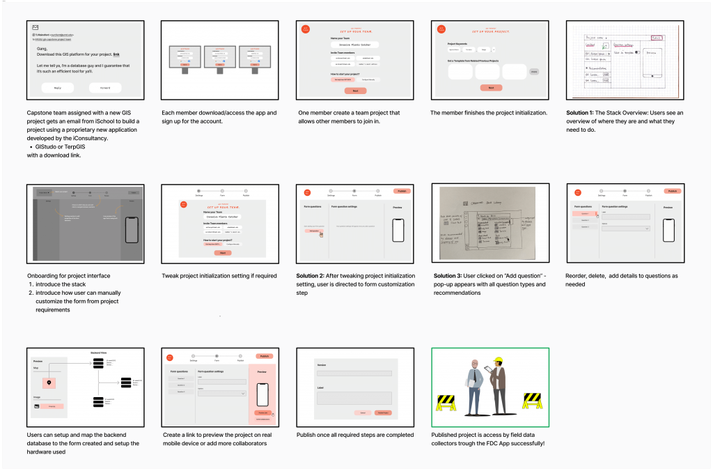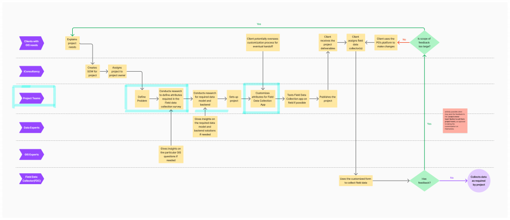 We mapped out the basic workflow for GIS data collection based on insights from expert interviews. The flow involves two main user groups: