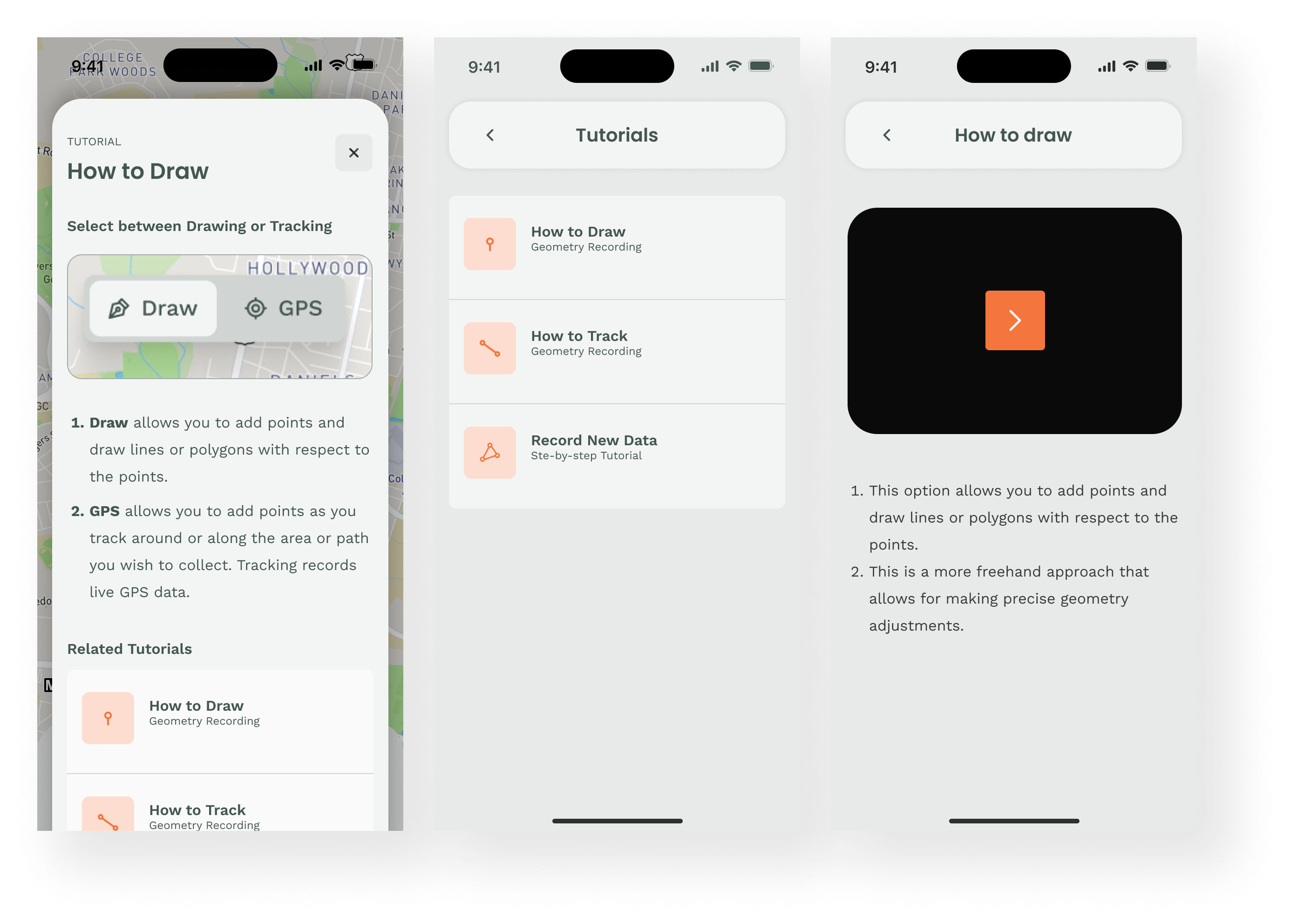 The Field Data Collection mobile app offers the ability to draw or GPS live record a geometry on map (line, or polygonal). The geospatial data will be mapped and submitted to the database.